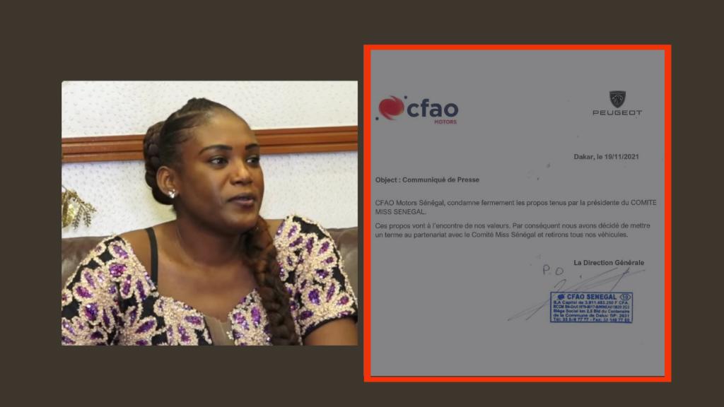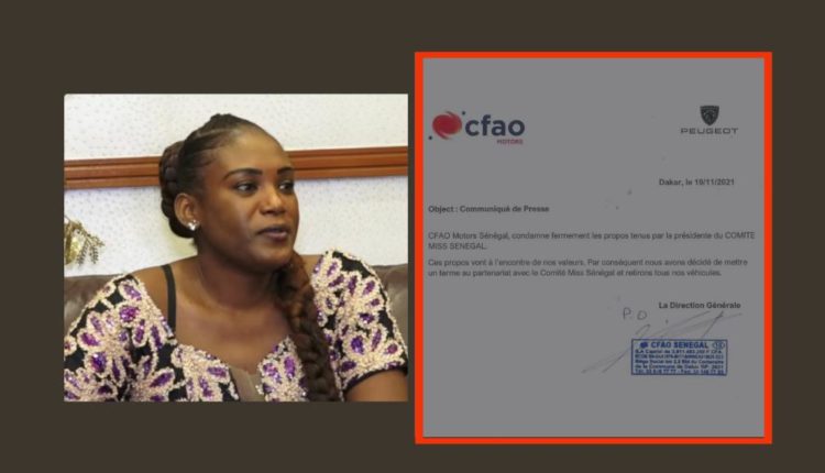 « Cfao Motors Sénégal condamne fermement les propos tenus par la présidente du comité d’oganisation du comité Miss Sénégal. Ces propos vont à l’encontre de nos valeurs. Par conséquent nous avons décidé de mettre un terme au partenariat avec le comité miss sénégal et retirons nos véhicules », lit-on dans leur communiqué de presse, parcouru par iGFM.