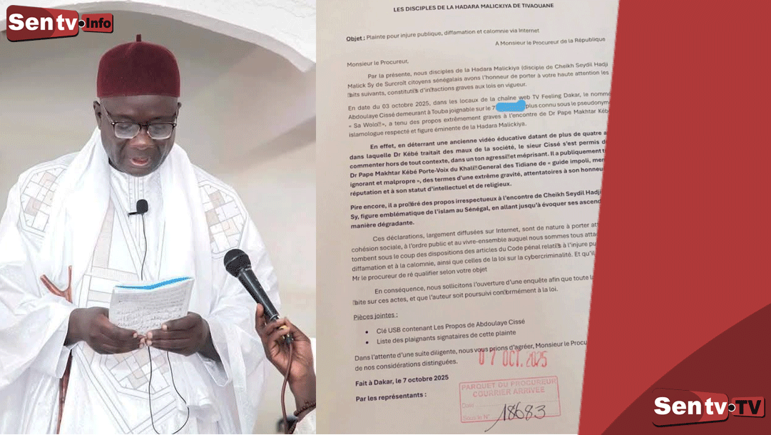 SENTV : Un front religieux s’est levé ce mardi à Tivaouane, épicentre de la confrérie tidiane, où 492 disciples de la Hadara Malickiya ont officiellement déposé une plainte collective auprès du procureur de la République contre M. Abdoulaye Cissé, connu sur les réseaux sociaux sous le pseudonyme « Sa Wolof ».