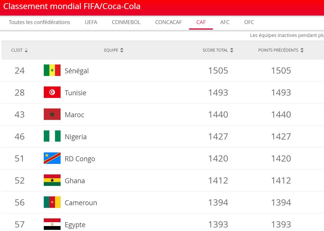 Le Sénégal reste toujours 1ère nation africaine.