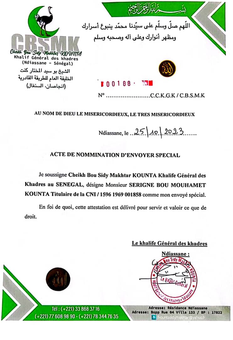 Ndiassane : Le Khalif Général des Khadres nomme sont envoyé spécial Serigne Bou Mouhamet Kounta (Communiqué)