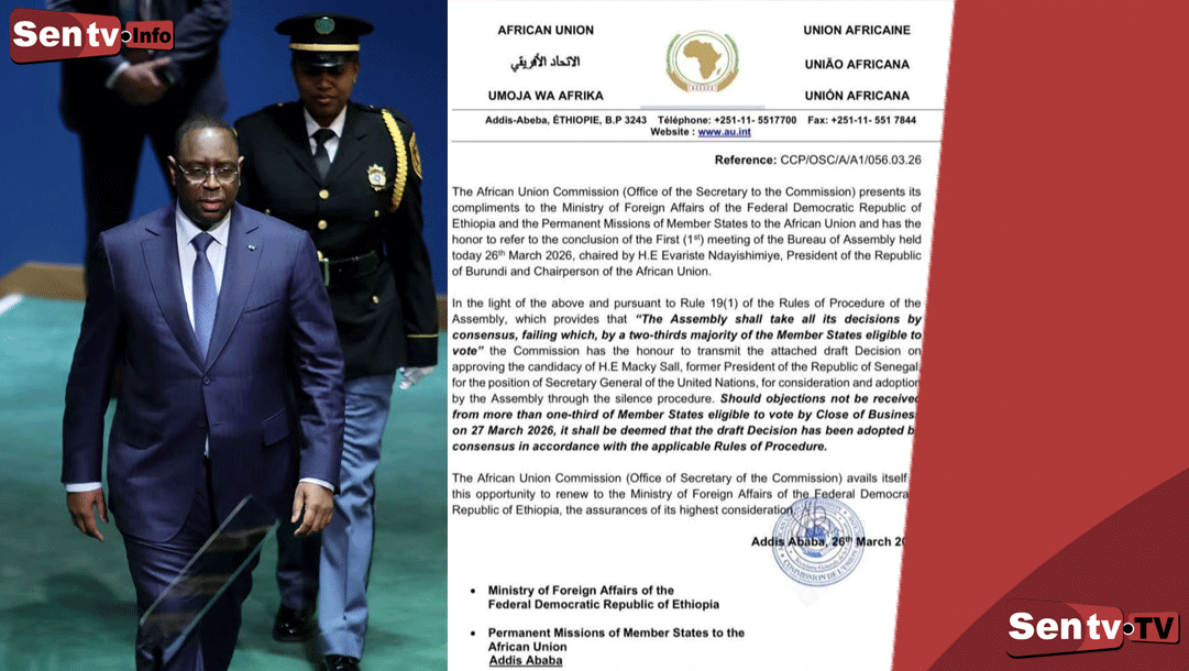 SENTV : Dans un communiqué publié ce jeudi 26 mars 2026 à Addis-Abeba, le Secrétariat de la Commission de l’Union africaine (UA) a officiellement annoncé l’approbation de la candidature de Macky Sall pour le poste de Secrétaire général de l’Organisation des Nations Unies (ONU).
