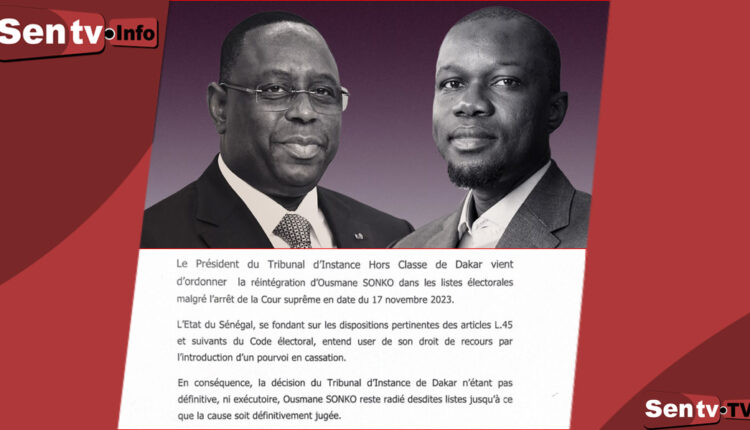 « Le Président du Tribunal d’Instance Hors Classe de Dakar vient d’ordonner la réintégration d’Ousmane SONKO dans les listes électorales malgré l’arrêt de la Cour suprême en date du 17 novembre 2023« , a rappelé les avocats de l’Etat du Sénégal dans un communiqué parvenu à la rédaction de Senego.