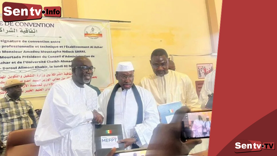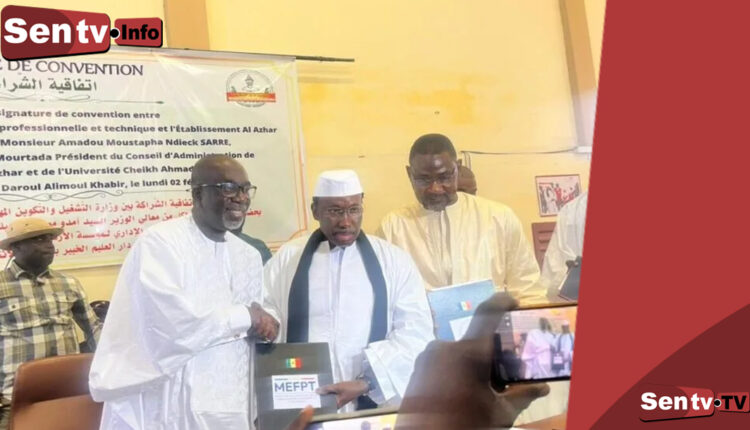 SENTV : Le ministère de l’Emploi et de la Formation professionnelle et technique a franchi une nouvelle étape dans sa politique d’inclusion éducative en signant une convention de partenariat avec l’Institut islamique Al Azhar de Touba. L’accord vise à accompagner l’établissement dans son développement et à renforcer l’offre de formation professionnelle au profit des jeunes de Touba et du département de Mbacké.