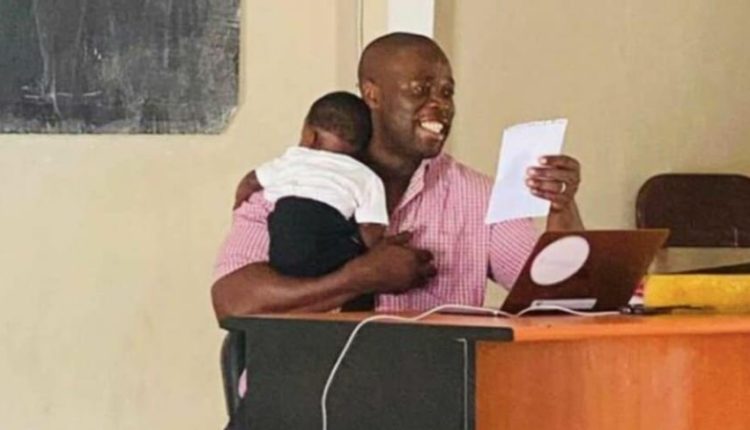 Le professeur Labaly Tourè porte un bébé durant son cours. Cet enfant n’est autre que le fils d’une étudiante présente dans l’amphithéâtre. Une façon pour l’enseignant de rendre hommage à toutes les mamans étudiantes.
