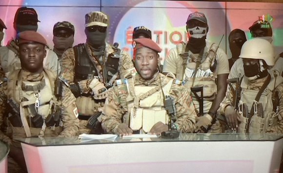Le capitaine Ibrahim Traoré a lu un communiqué annonçant la dissolution du gouvernement et de la Constitution, ainsi que la fermeture des frontières du pays jusqu’à nouvel ordre.